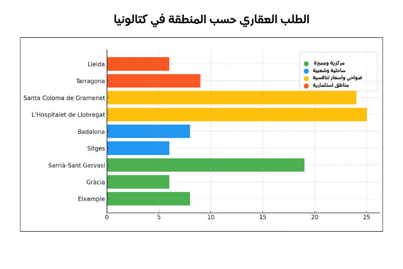 تشهد بعض المناطق في كتالونيا تفاوتًا ملحوظًا في مستويات الطلب والأسعار العقارية. ففي وسط برشلونة، تبرز أحياء مثل Eixample، Gràcia، وSarrià-Sant Gervasi كوجهات جذابة للمستثمرين والمقيمين نظرًا لموقعها المركزي وتوفر الخدمات المميزة. كما تحظى المدن الساحلية مثل Sitges وBadalona بشعبية متزايدة بفضل طبيعتها الخلابة وجاذبيتها السياحية.