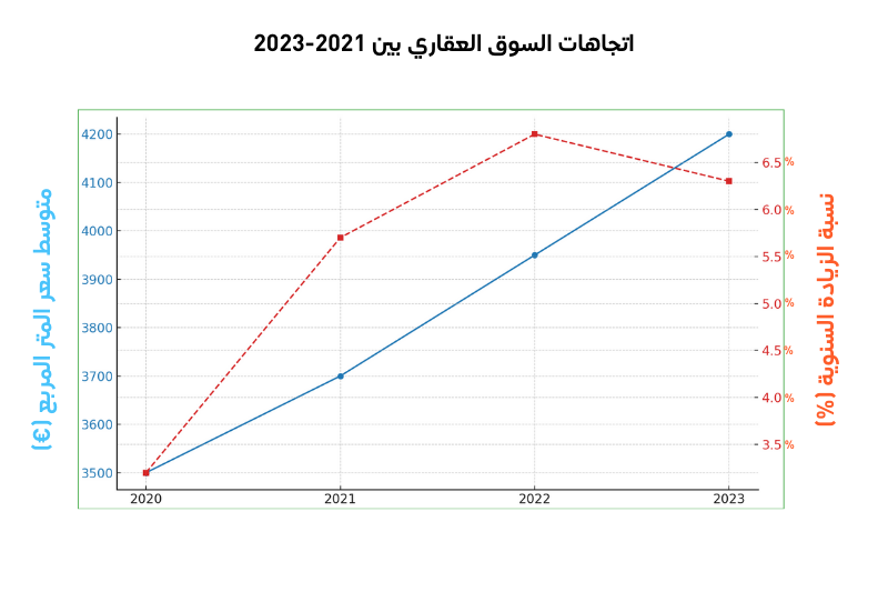 | السنة | متوسط سعر المتر المربع (€) | نسبة الزيادة السنوية (%) |