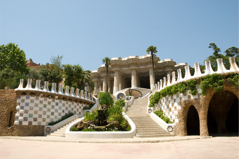 Park Güell هي منطقة حديقة تقع في التلال المعلقة فوق مدينة برشلونة مع الكثير من العناصر المعمارية التي تستحق الاستكشاف. القطعة المركزية هي بلا شك السمندل الفسيفسائي الشهير متعدد الألوان، ولكن هناك الكثير من الأعمال الأخرى مثل مقعد السربنتين والأعمدة التي تحيط ببلاط السقف الفسيفسائي والجسور والمناظر الرائعة لبرشلونة للاستمتاع بها أثناء وجودك هناك.