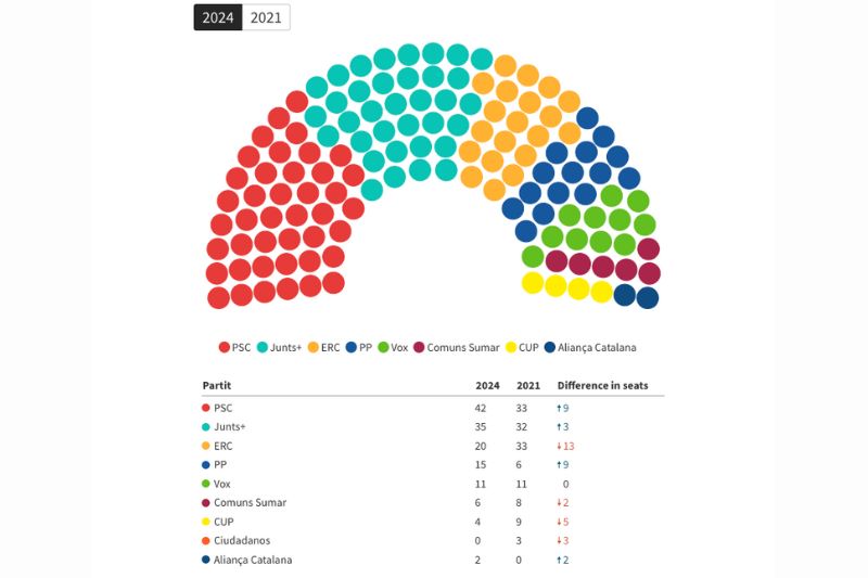 وتصدر الحزب الاشتراكي الانتخابات الكتالونية، حيث حصل على 42 مقعدًا، بزيادة تسعة مقاعد منذ التصويت الأخير، وحصل على 28٪ من الأصوات في جميع أنحاء الإقليم.